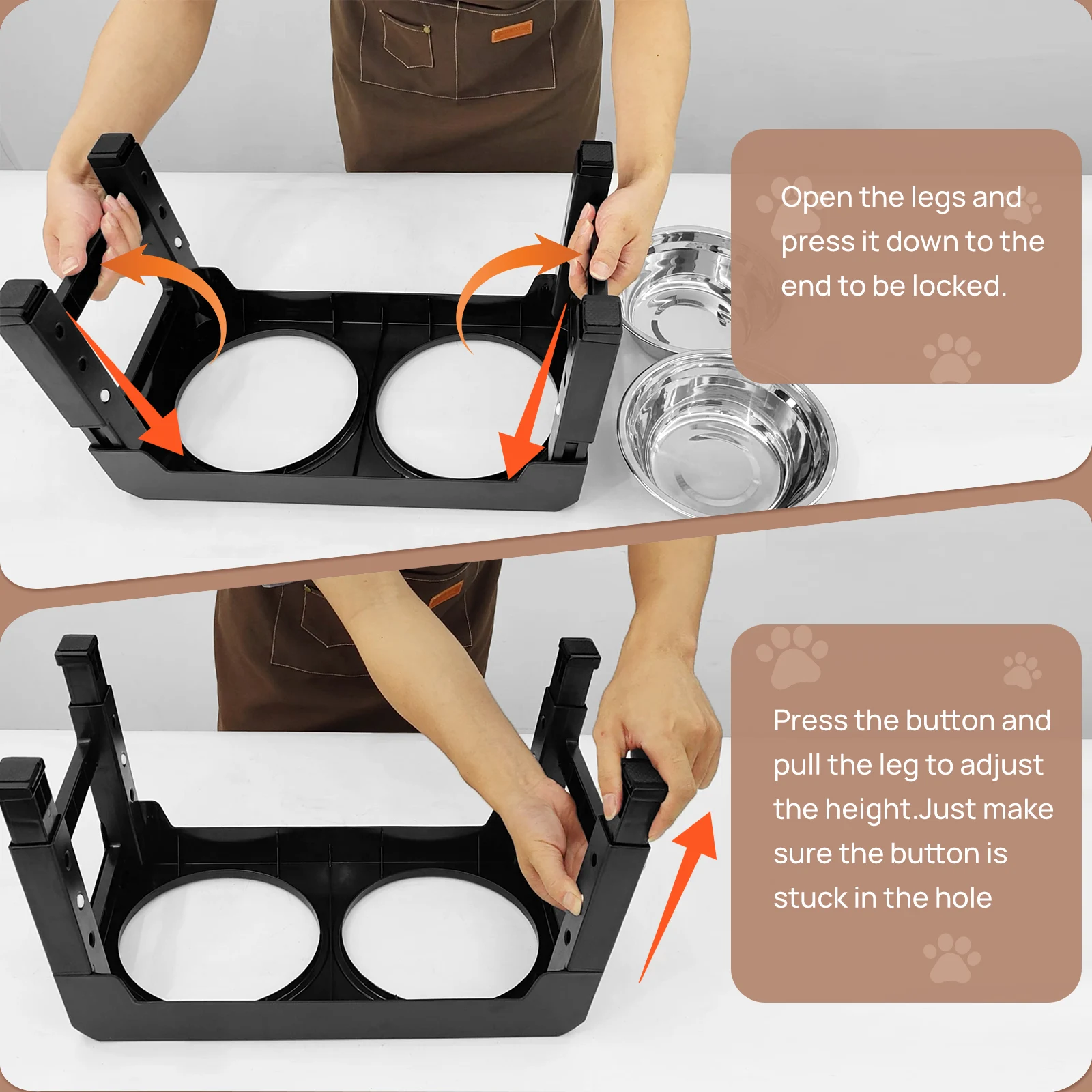 ⭐【Easy to Use and Store】: The 4 heights raised dog food bowl and water bowls station no need to assemble, only by adjusting button can achieve customized heights. The legs can be easily folded and placed for clutter-free space storage.