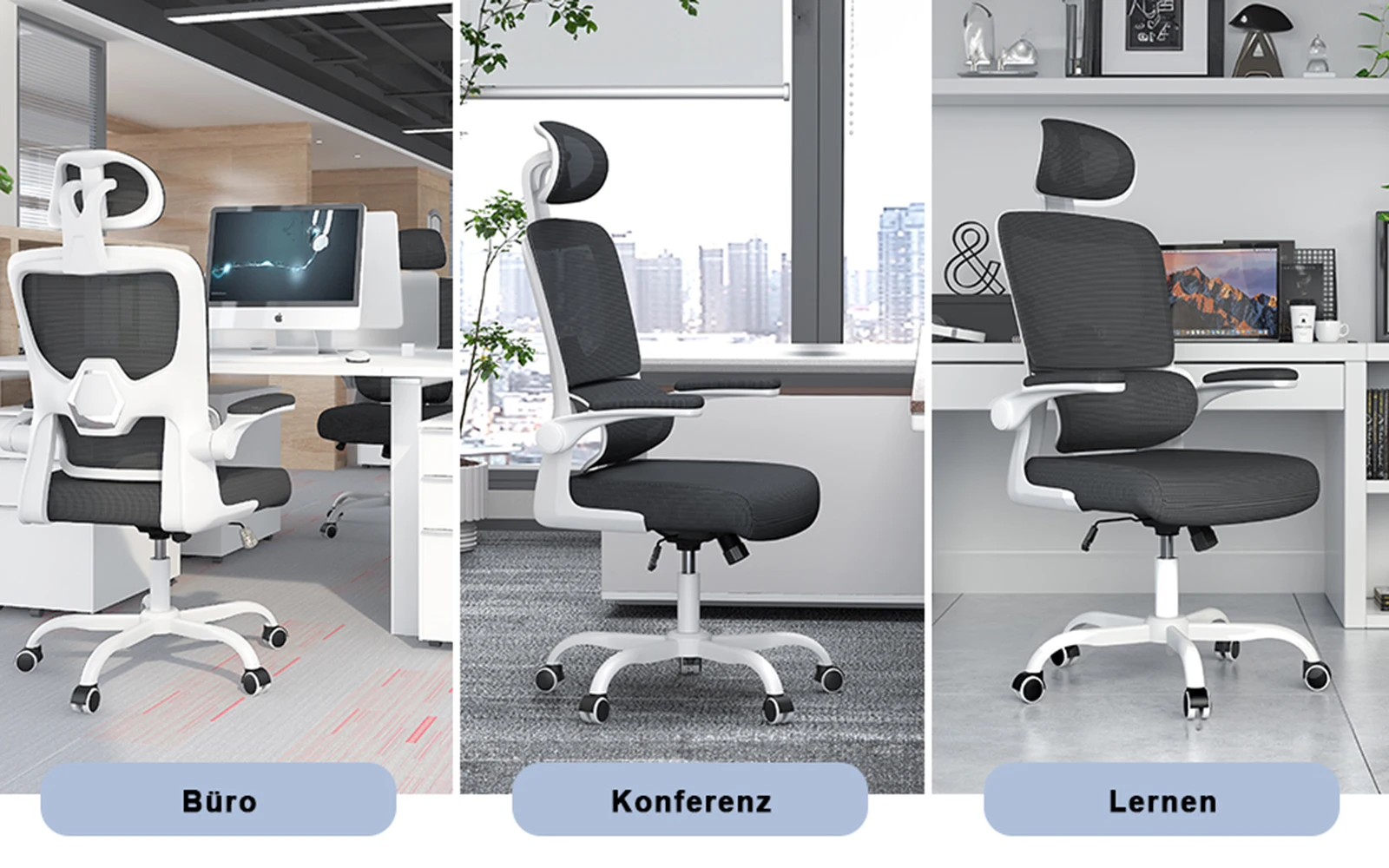 — Flip-up armrests: The arm rests can be turned up and down at will. When you are leading back in the chair to have a rest, the padded arm rests are perfect for backing your elbows. Or when you don’t need to use the chair, you can flip up the arm rests and push the chair under the desk to save space.