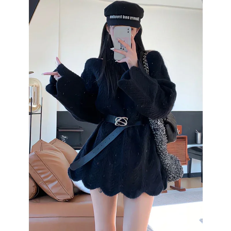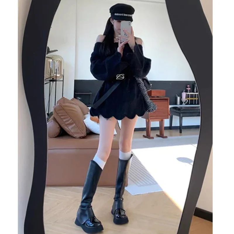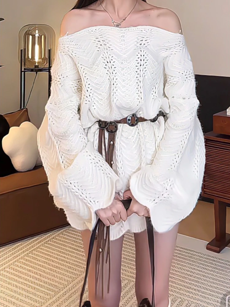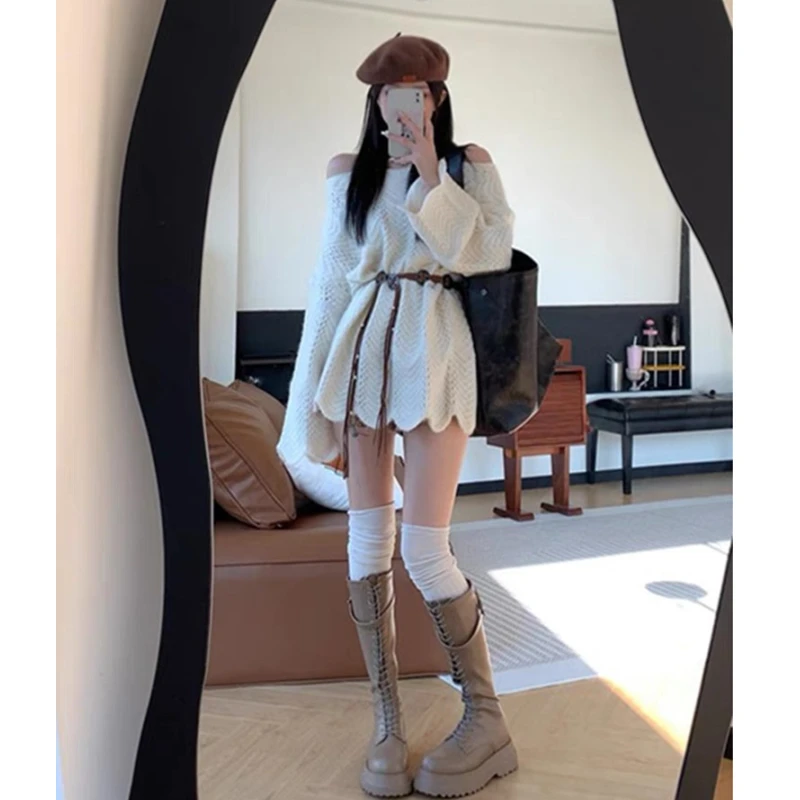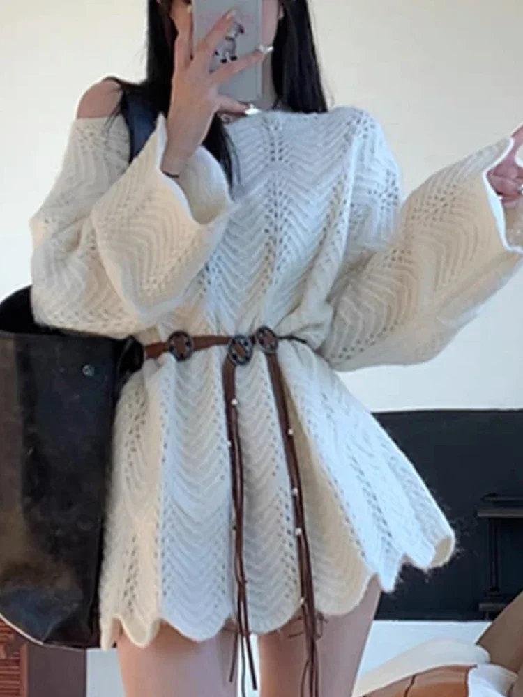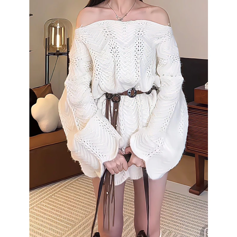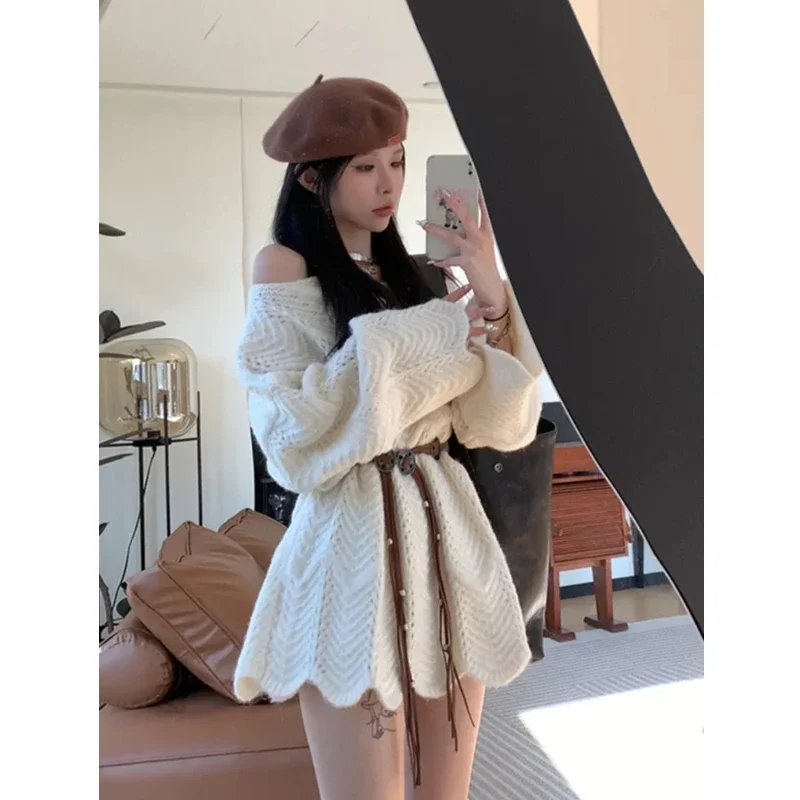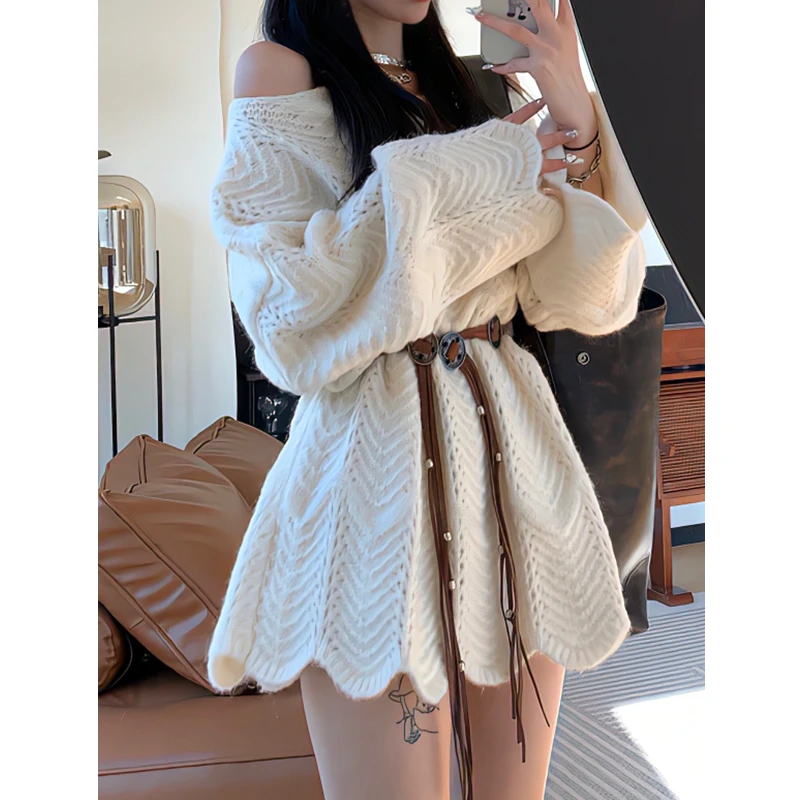 Fashion Off Shoulder Pullover Women Long Sweater Dress Autumn Elegant Knitted Long Sleeve Loose Casual Solid Tops Sweet Knitwear