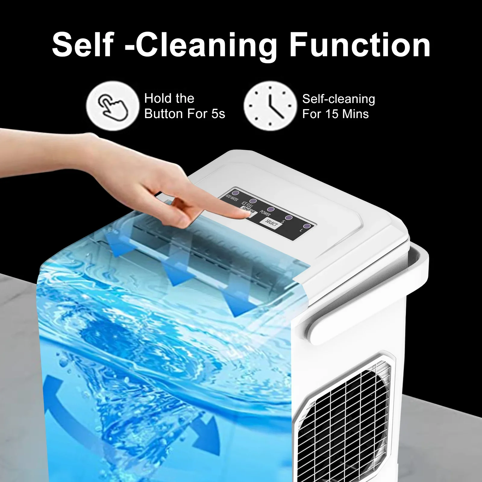 Operation panel functions: add water, full ice, large/small ice, power switch/clean, select