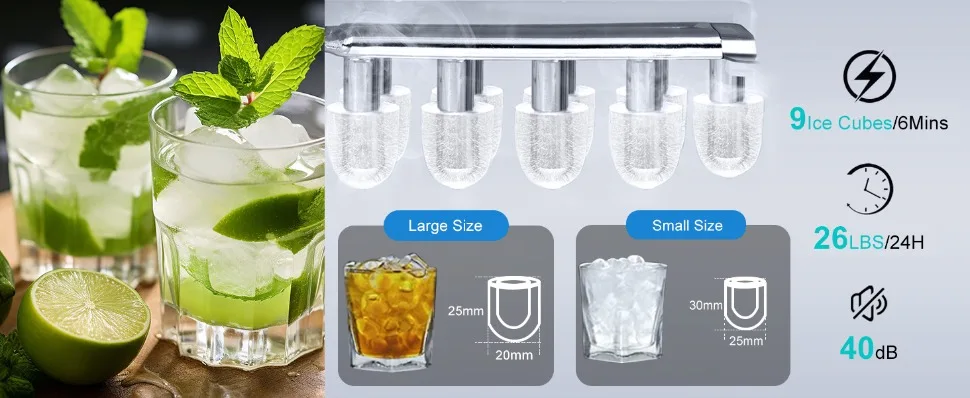 Double-size ice type: Two bullet ice sizes are available in S (20×25mm) and L (25×30mm), which are suitable for different cold drink needs (such as cocktails, iced coffee, etc.).